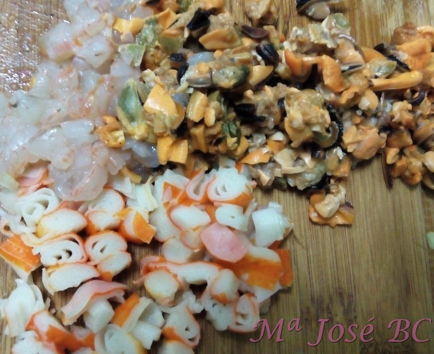 Incorporamos mejillones, gambas y surimi picados a cuchillo.